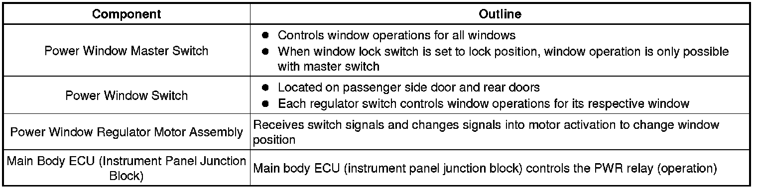 The main controls of this system are: the power window master switch which is built into the driver side door, and the power window switches which are built into the front passenger side door and rear doors. Pressing the switch or any of the switches on the master switch transmits an UP or DOWN signal to the corresponding power window regulator motor.