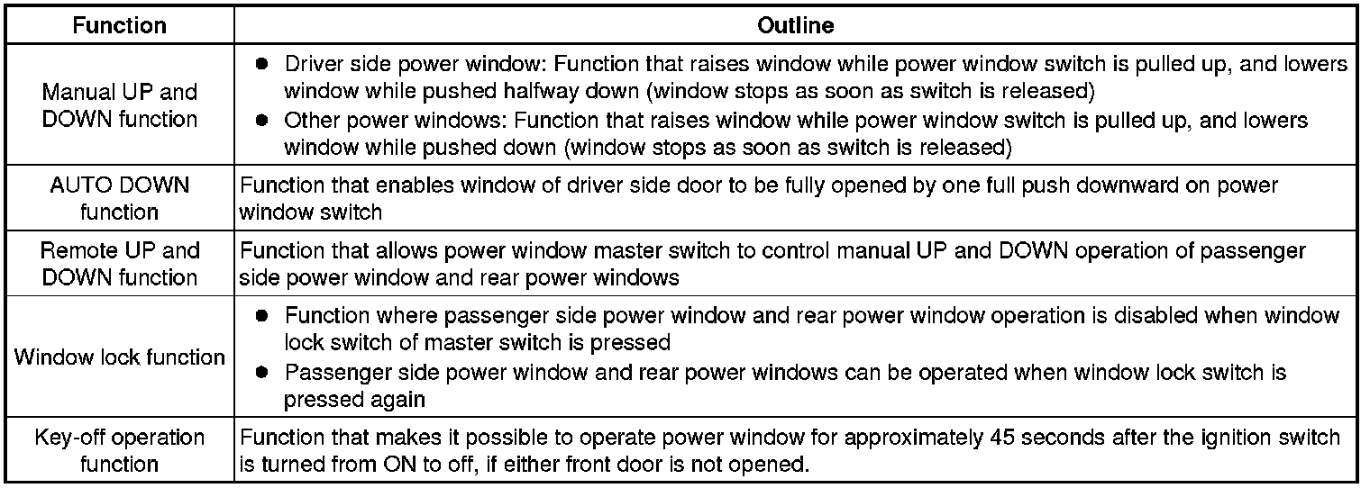 The power window control system has the following functions.