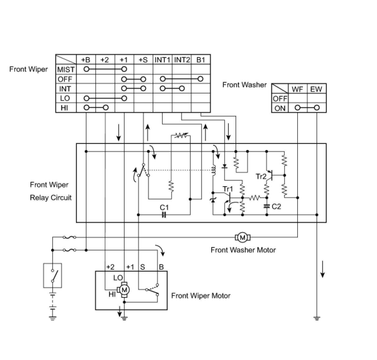 (b) If the front wiper switch is turned to the INT position, current flows from the already charged capacitor C1 through terminals INT1 and INT2 of the front wiper switch to Tr1 (transistor). When Tr1 turns on, current flows from terminal +S of the front wiper switch to terminal +1 of the front wiper switch, to terminal +1 of the wiper motor, to the wiper motor and finally to ground, causing the wiper motor to operate. At the same time, current flows from capacitor C1 to terminal INT1 and INT2 of the front wiper switch. When the current flows from capacitor C1 ends, Tr1 shuts off the relay to stop the wiper motor.