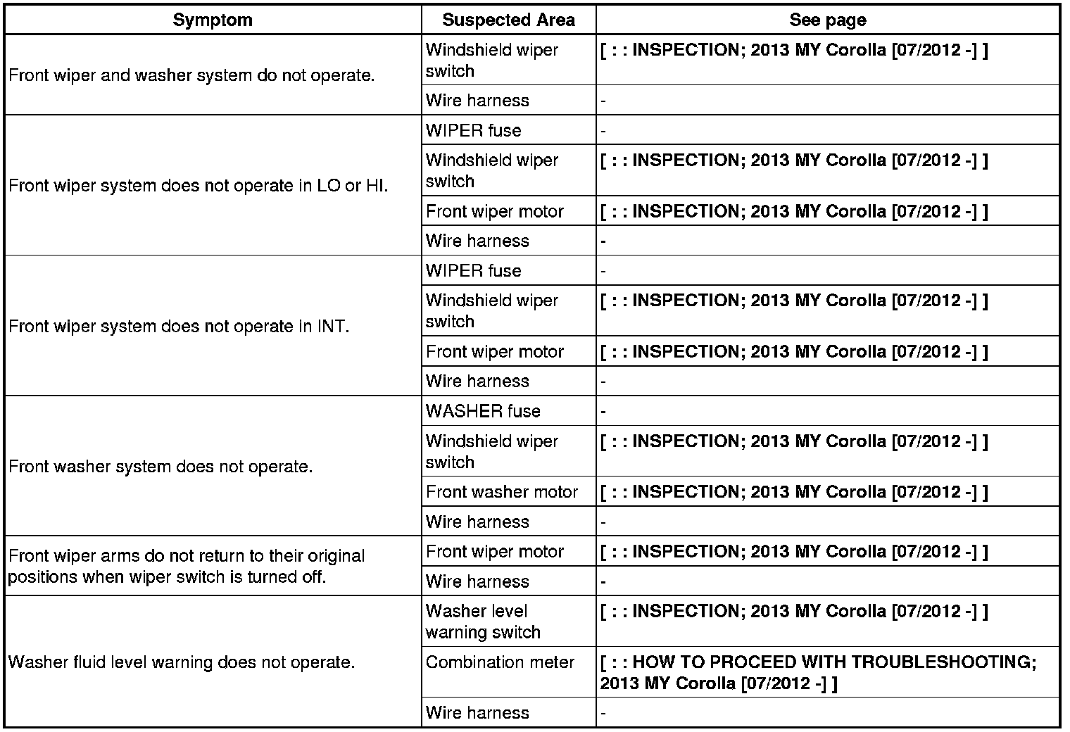 WIPER / WASHER: WIPER AND WASHER SYSTEM: PROBLEM SYMPTOMS TABLE; 2013 MY Corolla [07/2012 -]