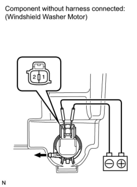 (d) Connect a battery positive (+) lead to terminal 1 of the windshield washer motor and pump, and a negative (-) lead to terminal 2.