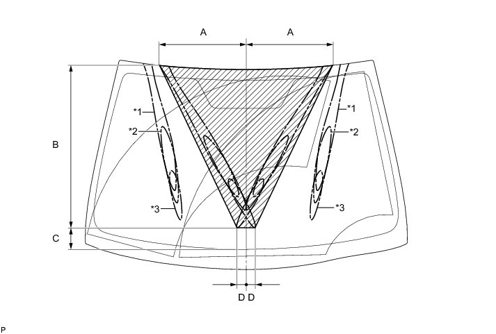 Washer fluid hits the windshield in the areas shown in the illustration.