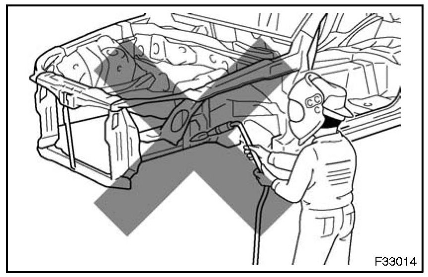 1. Rustproof high strength steel sheets are used for the body frame. Therefore, if these parts are heat repaired using an acetylene torch or equivalent, the crystalline structure changes, causing the strength of the steel sheets to decrease. Also, the zinc coating which is used to protect the body from rust will be damaged. This causes the surface of the steel sheets to become oxidized, which reduces their ability to resist rust.