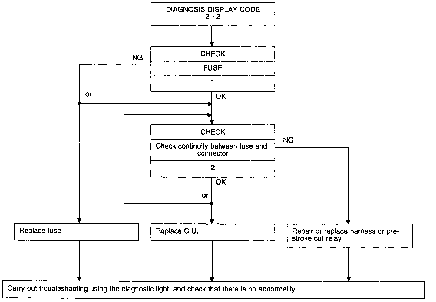 - Voltage is not as specified -> abnormality in power harness between power harness connectors, or pre-stroke cut relay abnormal -> repair or replace harness, or replace pre-stroke cut relay