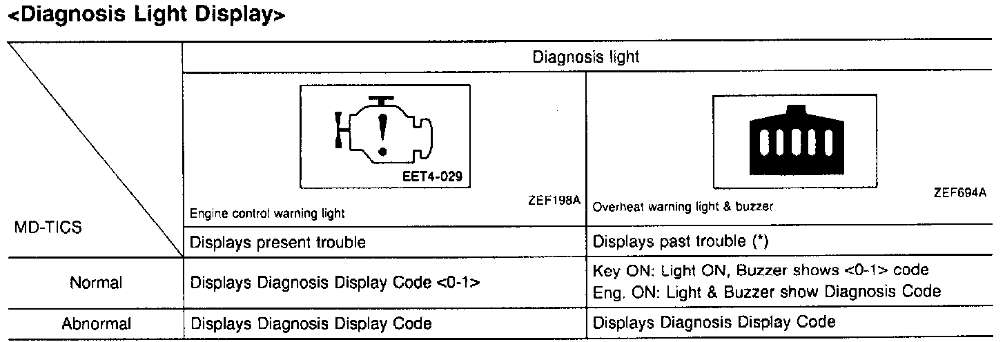 The result of the trouble diagnosis is displayed by the flashing (Diagnosis Display Code) of the diagnosis light (Engine Control warning light and Overheat warning light)