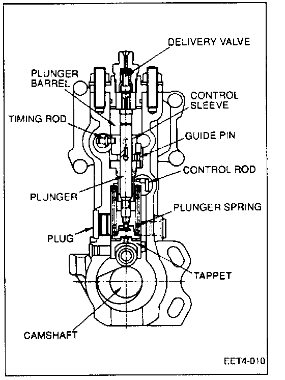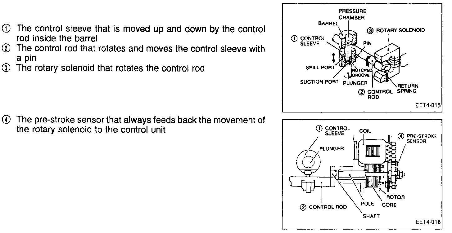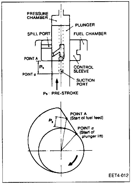 When the control sleeve is at the top, the pre-stroke is at its maximum, and as the plunger lift speed is fast, the fuel feed time can be made shorter. This means that the amount of fuel fed per unit time is larger and the fuel feed rate is higher.