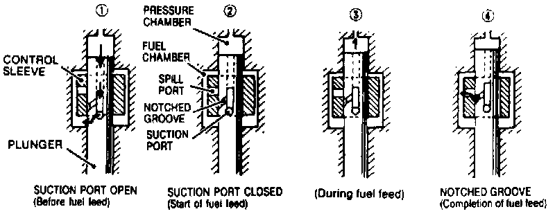 When the suction port and the notched groove (lead) of the plunger are connected with the spill port of the control sleeve, the high pressure fuel in the pressure chamber is drained through the spill port to the fuel chamber, and this completes the fuel feed.
