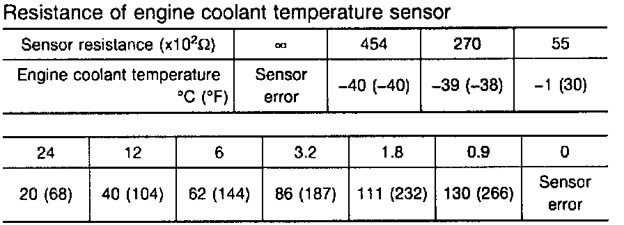 For details of the resistance value of the engine coolant temperature sensor, see the table for [CHECK/1]
