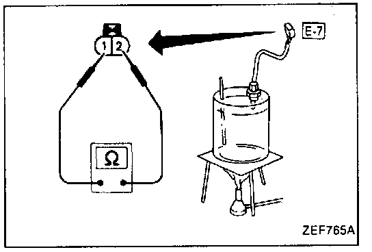 1. Measure the resistance between terminals (1) and (2) of engine coolant temperature sensor harness connector [E-7].