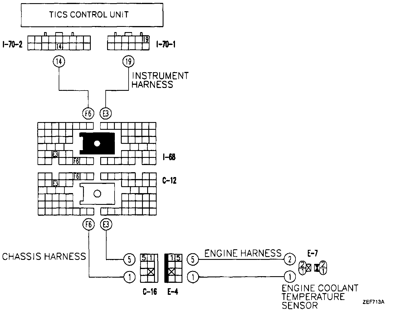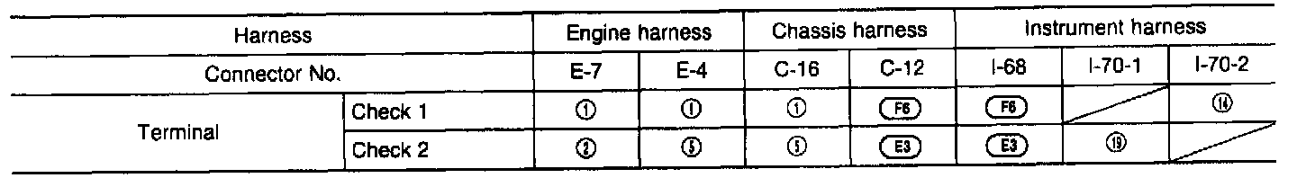 1. Check for continuity, short circuit, and insulation between instrument harness connectors [I-70-2] and [I-70-1] and harness connector [E-7] of the engine coolant temperature sensor.