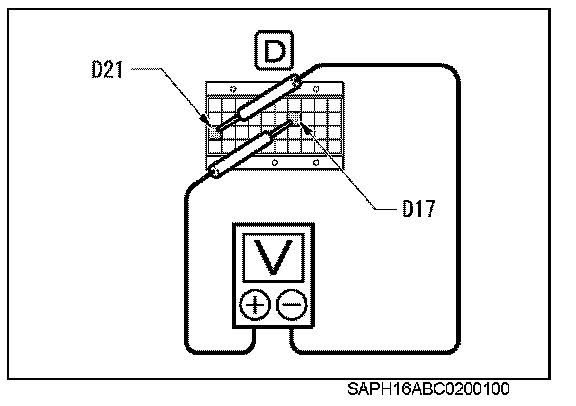 3. Set the starter switch to "ON" position and measure the voltage between AFSG (D21) and AGD6 (D17) terminals of signal check harness.