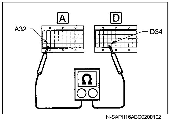 3. Measure the resistance between AFT+ (A32) and AGD2 (D34) terminals of ECU connector (vehicle harness side).