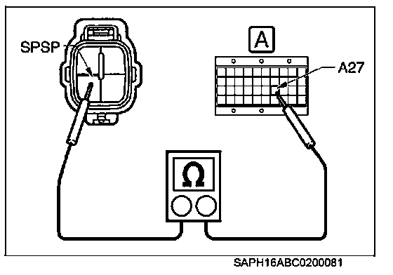 b. Measure the resistance between VS (A27) terminal of ECU connector (vehicle harness side) and SPSP terminal of vehicle speed sensor connectors (vehicle harness side).