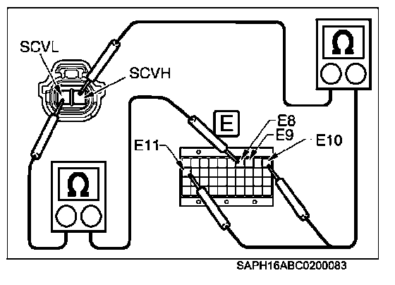 3. Measure the resistance between SCVH (E10, E11) terminal of ECU connector (vehicle harness side) and SCVH terminal of SCV connectors (vehicle harness side). In the same way, measure the resistance between SCVL (E8, E9) terminal of ECU connector and SCVL terminal of SCV connector.