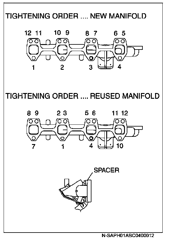 1. Install the exhaust manifold onto the cylinder head and tighten the mounting nut in the order shown in the figure to the specified torque.