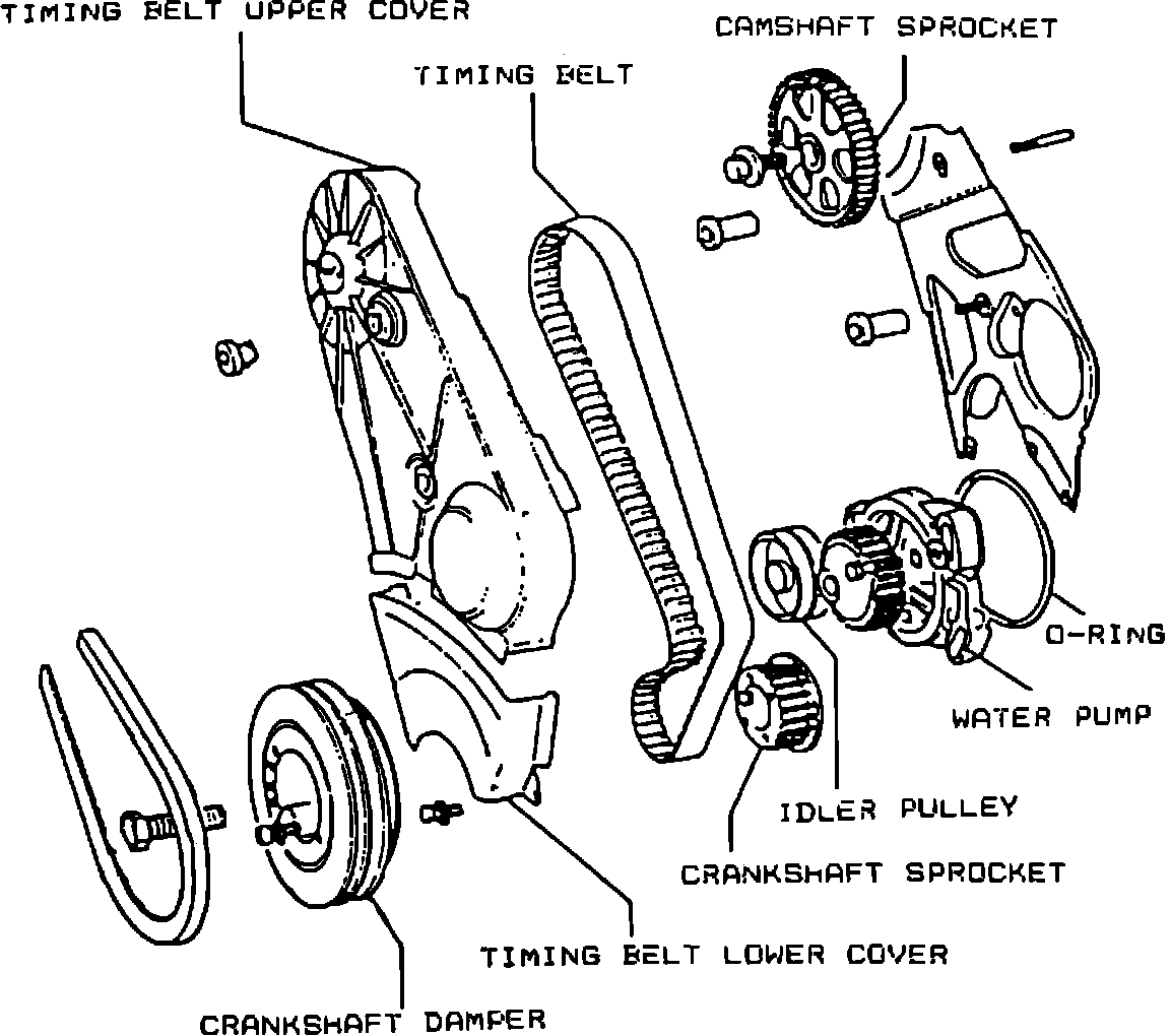 18. Adjust the timing belt tension by rotating the water pump upward (counter-clockwise), using a suitable pry bar or screwdriver through the hole in the radiator side cover to turn the pump. Tighten the pump retaining bolts. Check the water pump for leaks.