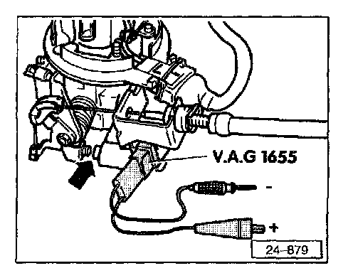 - Touch adapter wire (-) to Ground (GND) until plunger -arrow- is fully retracted.