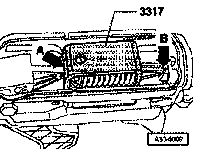 - Insert over-center spring into rear mounting first (arrow -B-), then operate clutch pedal until the retaining clamp seats on the mounting lug of the clutch pedal (arrow -A-).