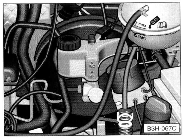 The correct fluid level is important for the proper functioning of the brake system. The fluid level in the brake fluid reservoir should always be between the "MAX" and "MIN" markings.
