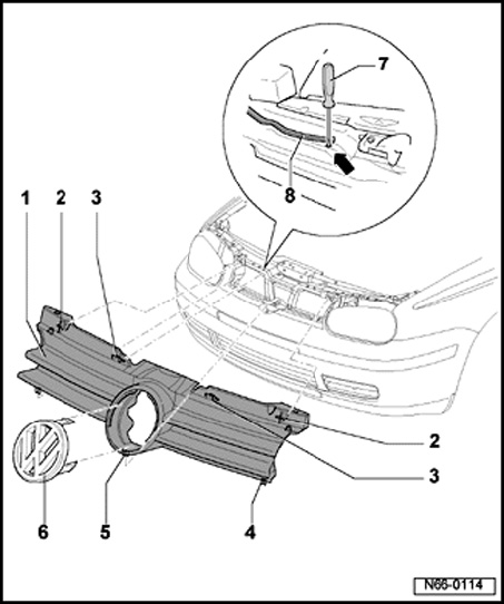 - Detach sealing strips - 8 - from radiator grille - 1 -.