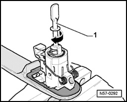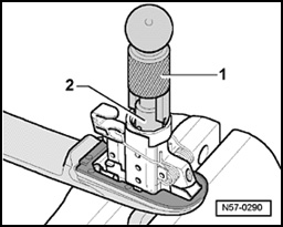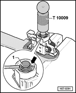 - Press down center rod - 1 - of Assembly tool T10009 . Doing this compresses torsion spring.