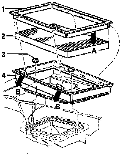 - Press filter housing clips in direction of arrows -B- and remove filter element with frame.