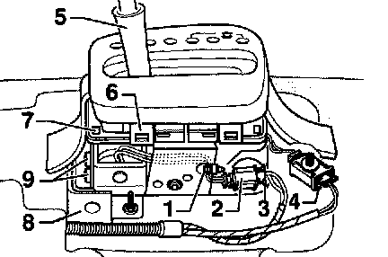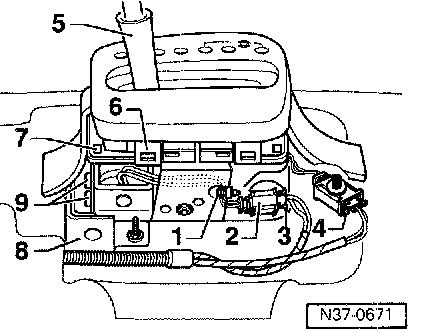 - Carefully pry off bracket at each corner -7- and remove. Carefully observe contact spring for selector lever position display!