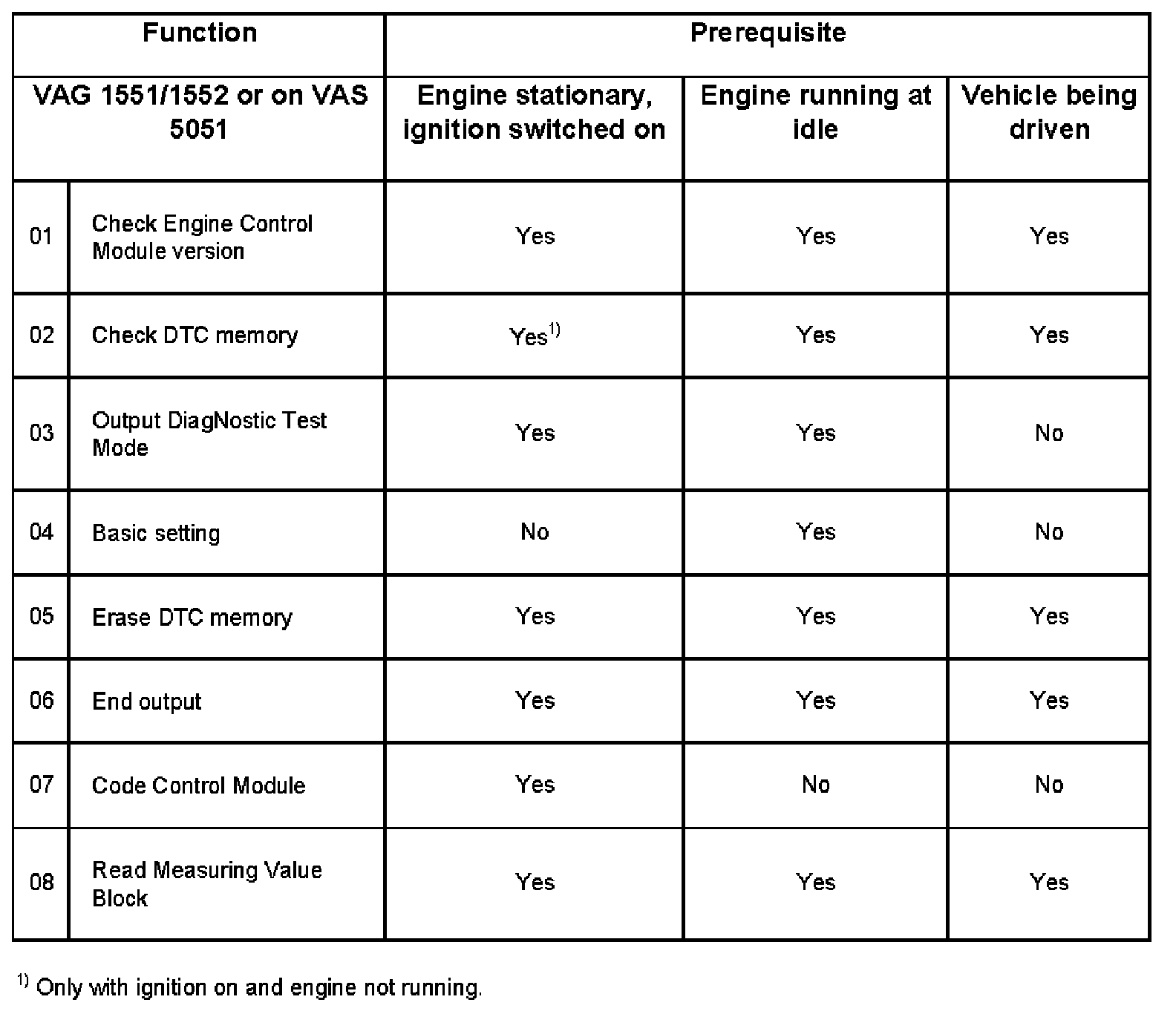 Selectable functions, when using Scan Tools (ST) VAG 1551/1552 or VAS 5051