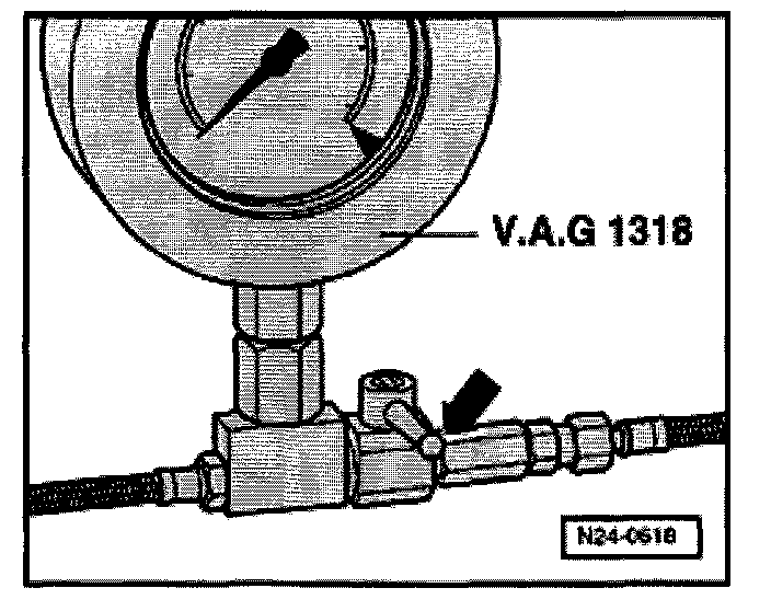 NOTE: This procedure simultaneously checks all of the fuel supply connections between the fuel delivery unit and the V.A.G 1318 pressure gauge connection.