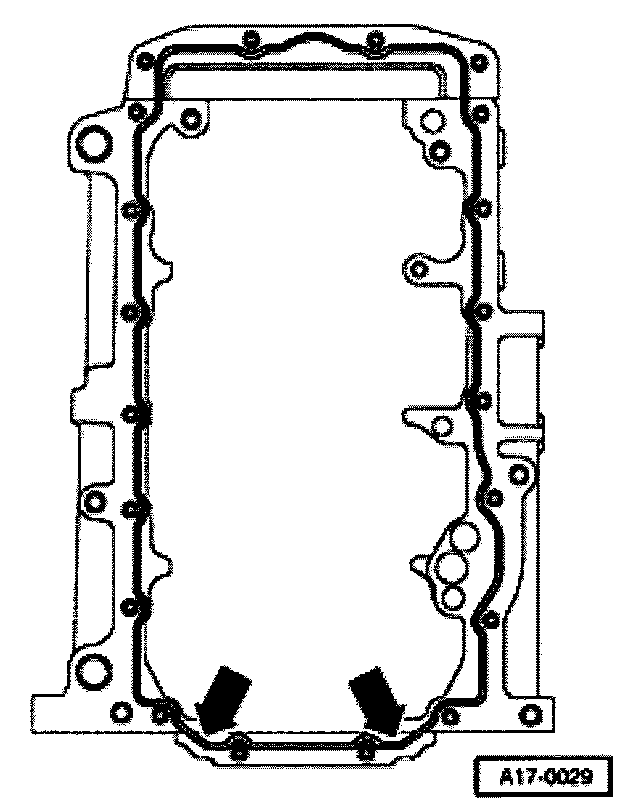 - Apply silicone sealing bead as shown to clean sealing surface of oil pan (Illustration shows position of sealant bead on engine block).