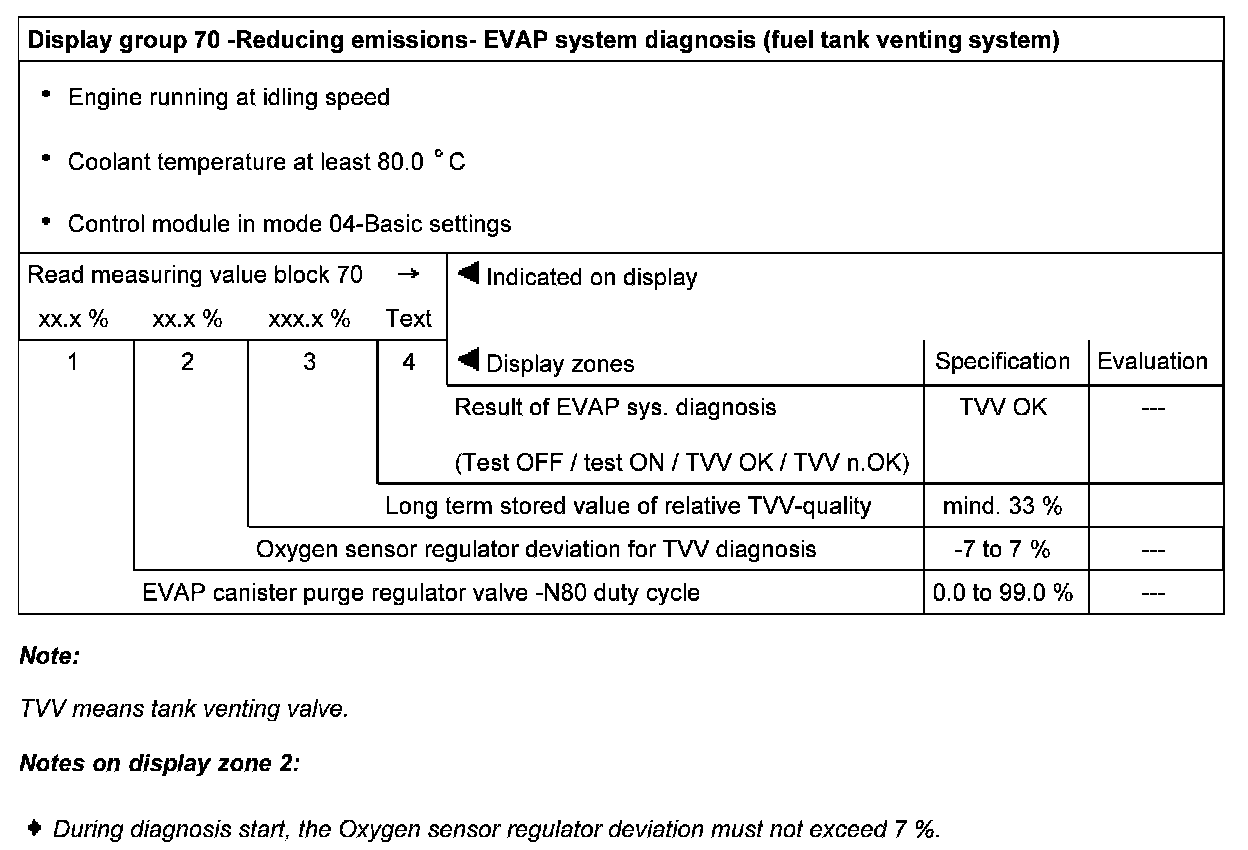 Display group 70 - Reducing emissions - EVAP system diagnosis (fuel tank venting system)
