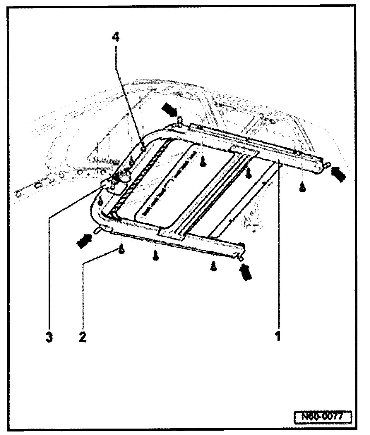 - Tighten carrier unit -1-, starting at sunroof drive motor -3- on left and right-hand sides moving rearward.