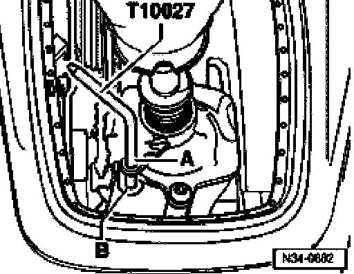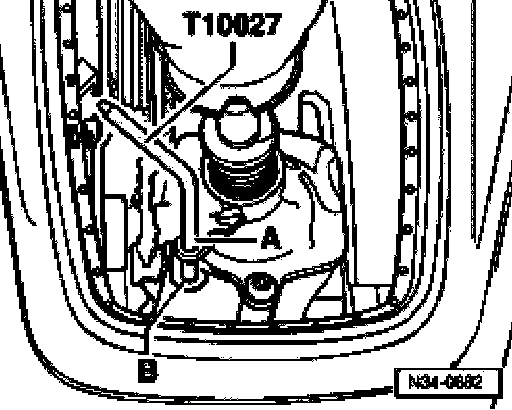 ^ Guide pin T10027 through hole -A- and into hole -B-.