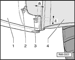 - Drill with 4 mm drill the front valance spoiler and wheel housing liner. Hole must be approx. 10 mm away from both outer edges, dimension - a - = 10 mm