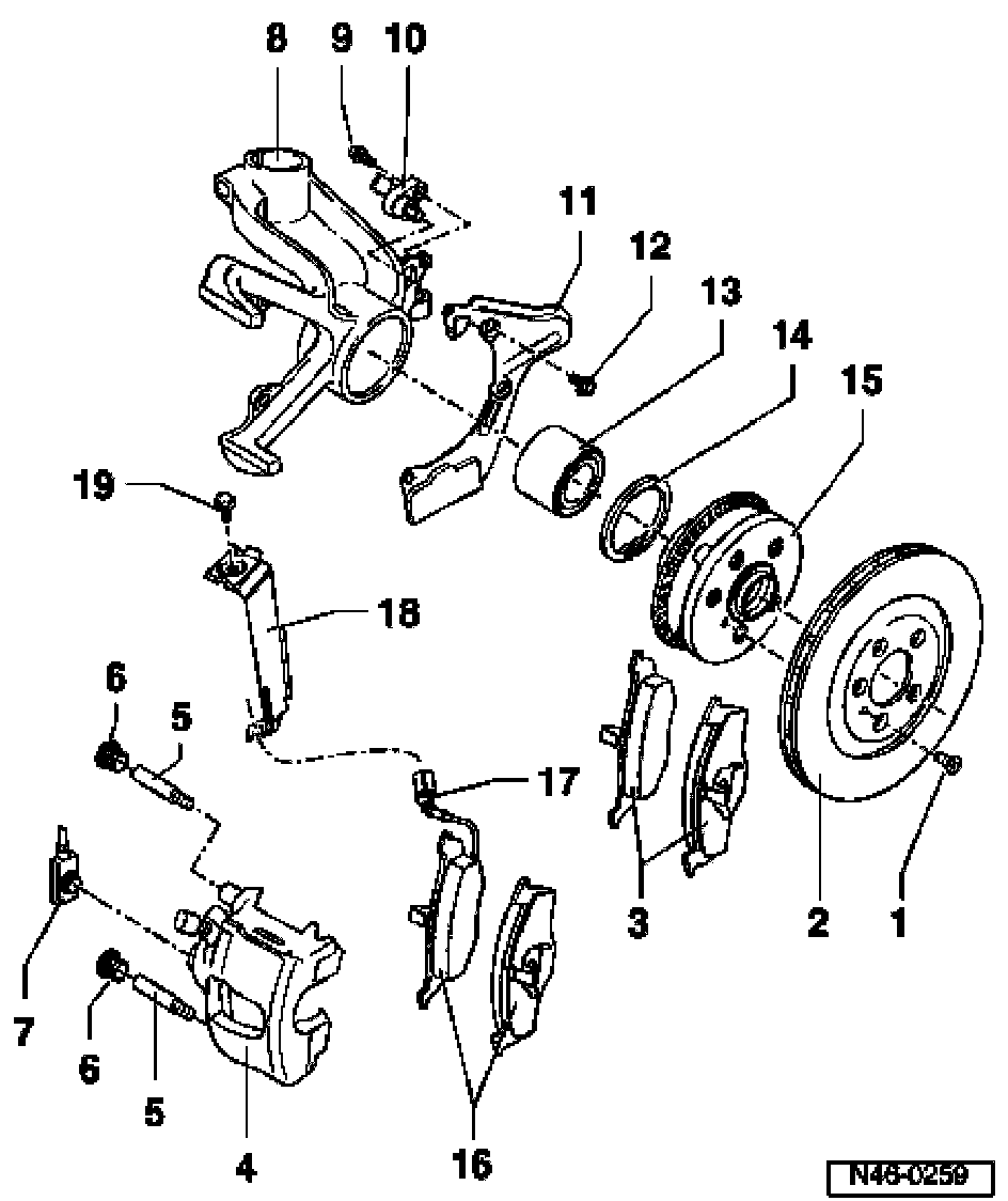 - Install brake pedal depressor VAG 1869/2 before removing a brake caliper or disconnecting a brake hose.