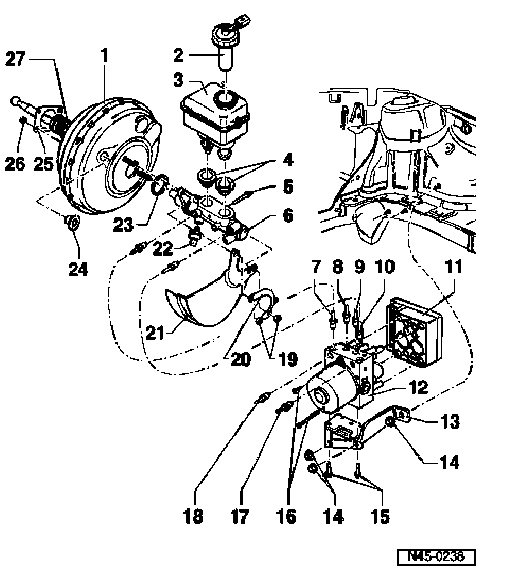 Note: Complete master cylinder and brake booster can be replaced independently of each other