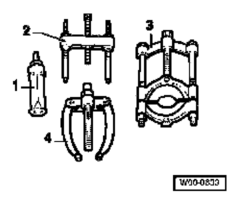 - Install press piece -1- with shoulder to bearing, press sleeve -2- with four stepped internal diameters to wheel bearing housing, hollow piston cylinder -3- with pull rod and special nut -4-.