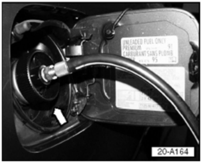 Basically, in the following procedure the EVAP system will be filled with smoke, the engine started and the LDP activated using the VAS 5051 or VAS 5052. With the LDP activated, and after clearing initial smoke away from the LDP area using compressed air, the system is then filled with smoke again and rechecked for smoke at the LDP filter.