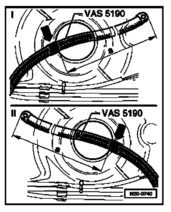 CAUTION: Secure Ground (GND) wire of fuel siphon device VAS 5190 to vehicle Ground (GND).