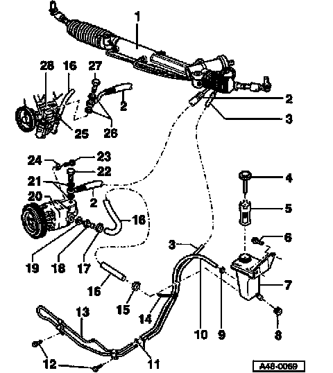 ^ If the fluid level in the reservoir is low, the steering system must be inspected for leaks.