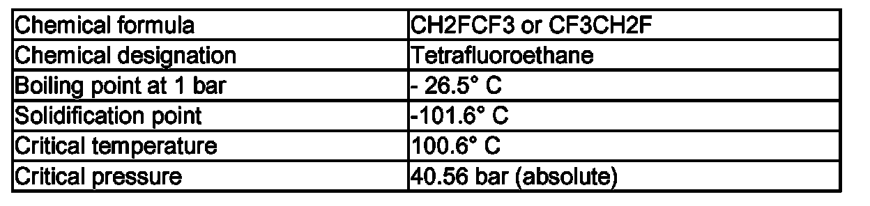 The refrigerant employed is tetrafluoroethane R134a, which boils at -26.5 degrees C at a vapor pressure of 1 bar.