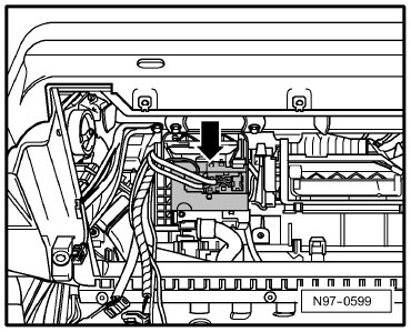 Below instrument panel, right, behind glove compartment -Arrow-.