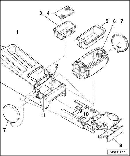 - Guide cup holder - 8 - into center console extension - 1 - until retaining hooks - 10 - strike against retaining tabs - 2 -.