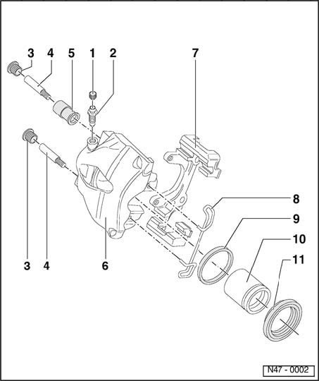 ^ Apply thin coat of assembly lubricant G 052 150 A2 to brake cylinders, pistons and seals.