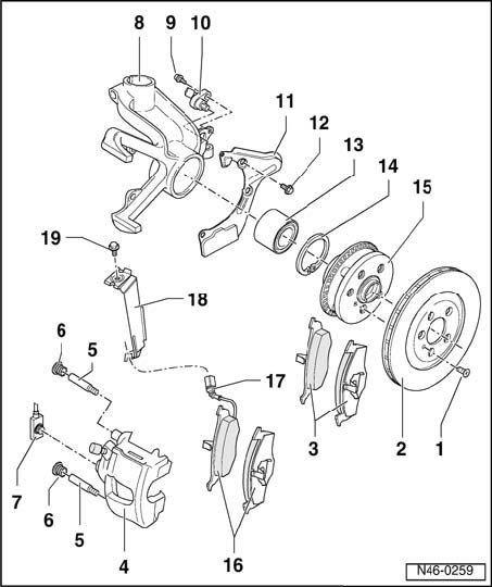 ^ Install brake pedal depressor VAG 1869/2 before removing a brake caliper or disconnecting a brake hose.