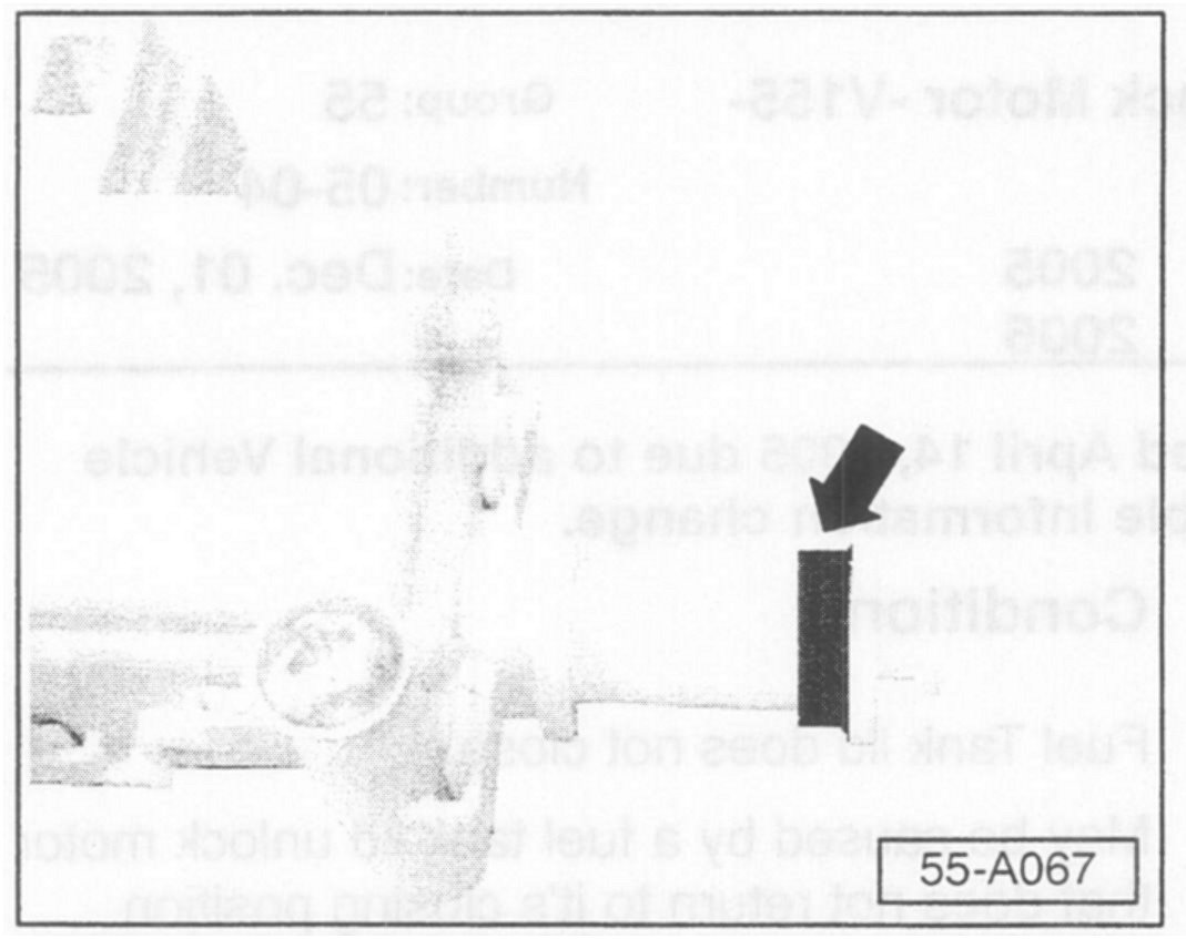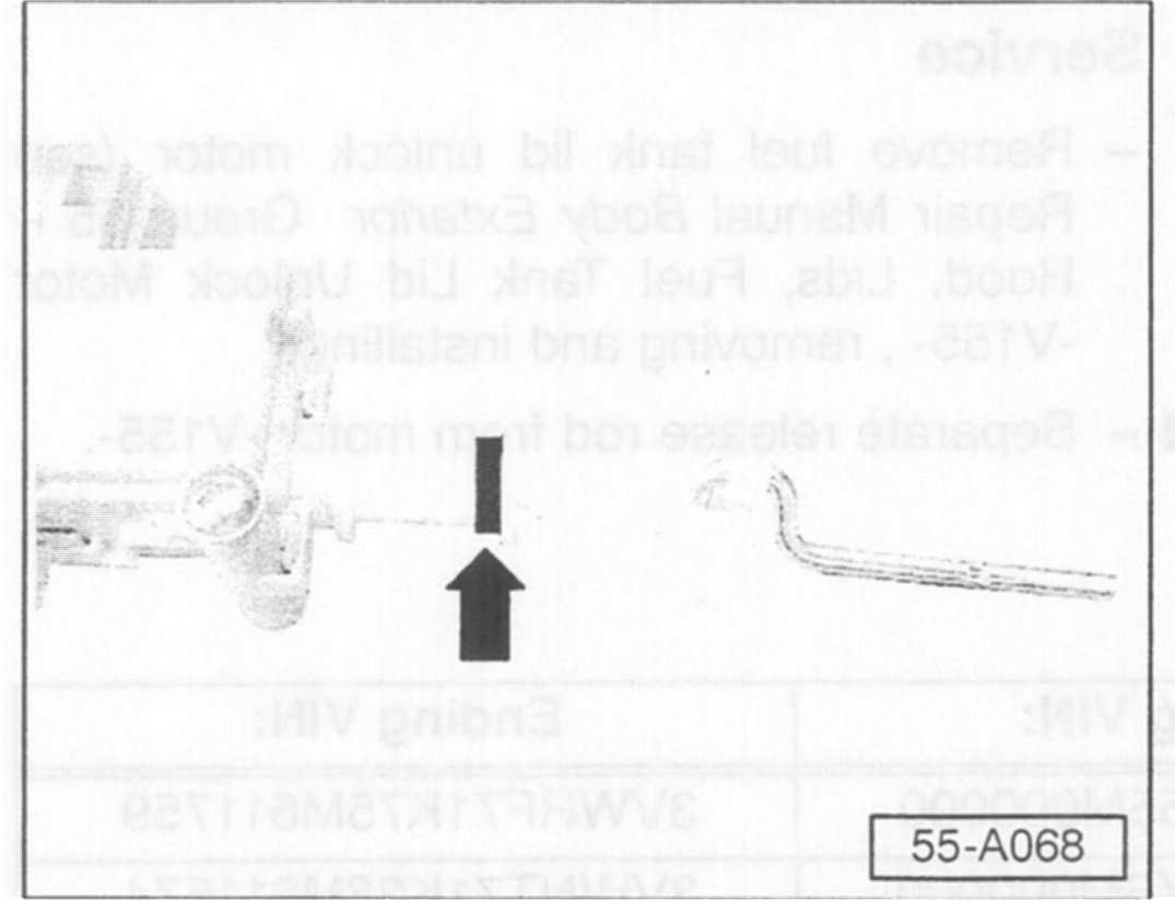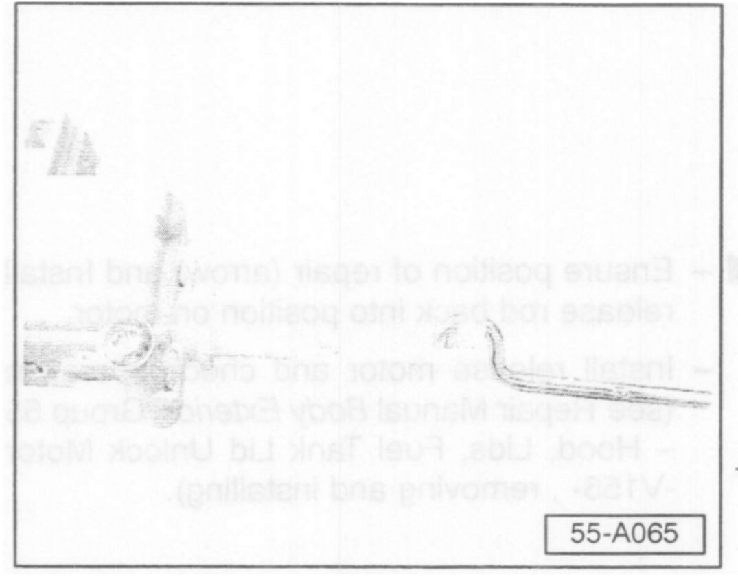 - Remove fuel tank lid unlock motor (see Repair Manual Body Exterior Group 55 - Hood, Lids, Fuel lank Lid Unlock Motor -V155- removing and installing).