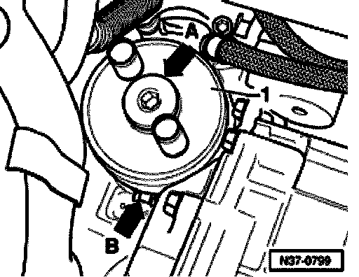 - When installing ATF cooler -1-, insert tab (arrow -B-) in opening on housing.