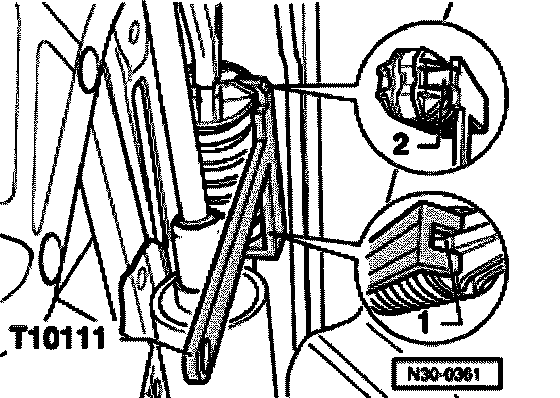 - Insert over-center spring with assembly clamp T10111 upward (in direction of arrow -A-) into bearing bracket and then turn in direction of arrow -B-.