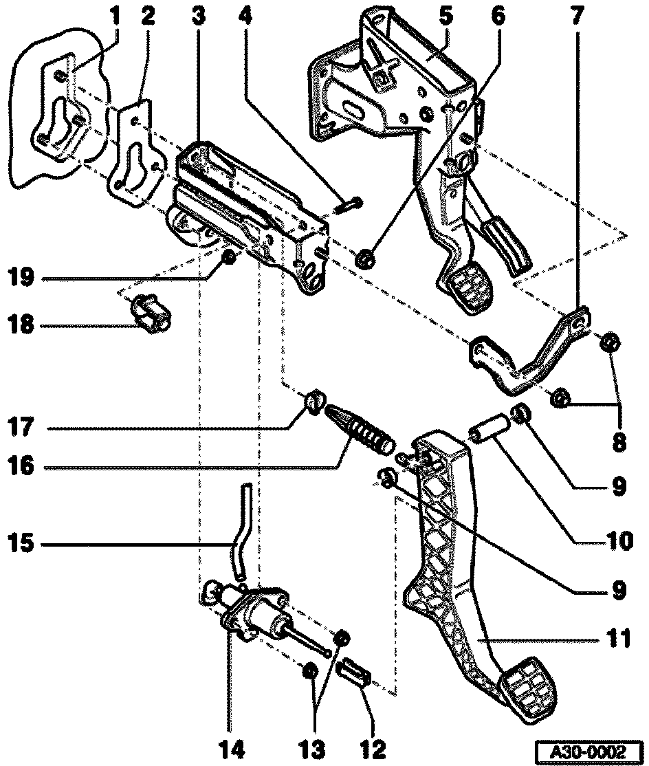 Pedal cluster, assembly overview, 02J, 5 Spd. M/T