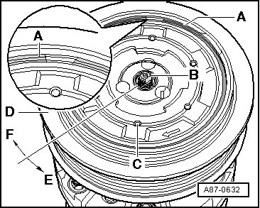 - Install the drive plate - C - on the compressor shaft - B - by rotating it in the direction of the arrow - F -.